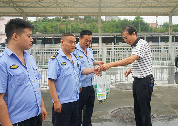 在火車站調(diào)度室,張曉強(qiáng)一行檢查當(dāng)日帶班領(lǐng)導(dǎo)、值班人員在崗在位情況,了解值班值守落實(shí)制度、工作安排和落實(shí)等情況。為駕駛員送去了毛巾、菊花茶、花露水、風(fēng)油精等降溫物品,與他們一起拉家常,詳細(xì)詢問(wèn)身體情況、工作和生活現(xiàn)狀,認(rèn)真傾聽面臨的困難訴求和對(duì)當(dāng)前工作的意見建議,叮囑他們做好夏季防暑降溫、安全運(yùn)營(yíng)工作。